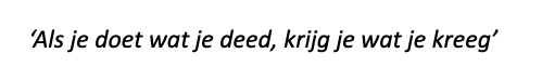 teruggevallen wordt op een aantal vaste patronen. Bij een kleur denkt men bijvoorbeeld vaak direct aan blauw of rood. Die antwoorden zitten bijna standaard in ons. Dat betekent, dat bij snel werken en schakelen, out of the box denken een uitdaging is. Daar gaat de sessie vandaag over, over ruimte om het anders te doen.’